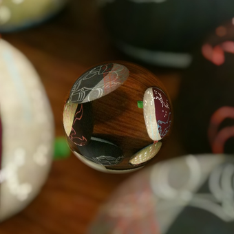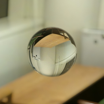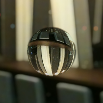 マクロレンズで撮影した透明なビー玉に、周囲の風景が写りこんでいるような写真が作成できる